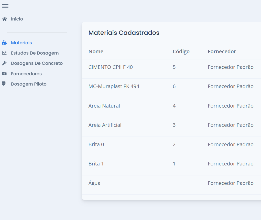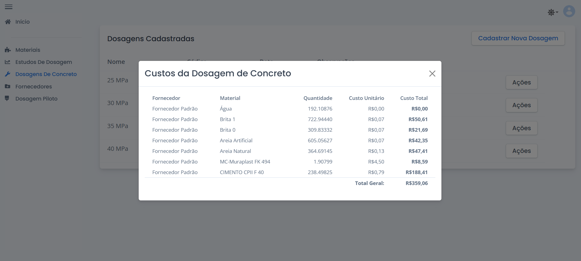 Com base nas características dos materiais e nos resultados do estudo de dosagem, o software gera composições de concreto conforme os requisitos de resistência e abatimento (slump).